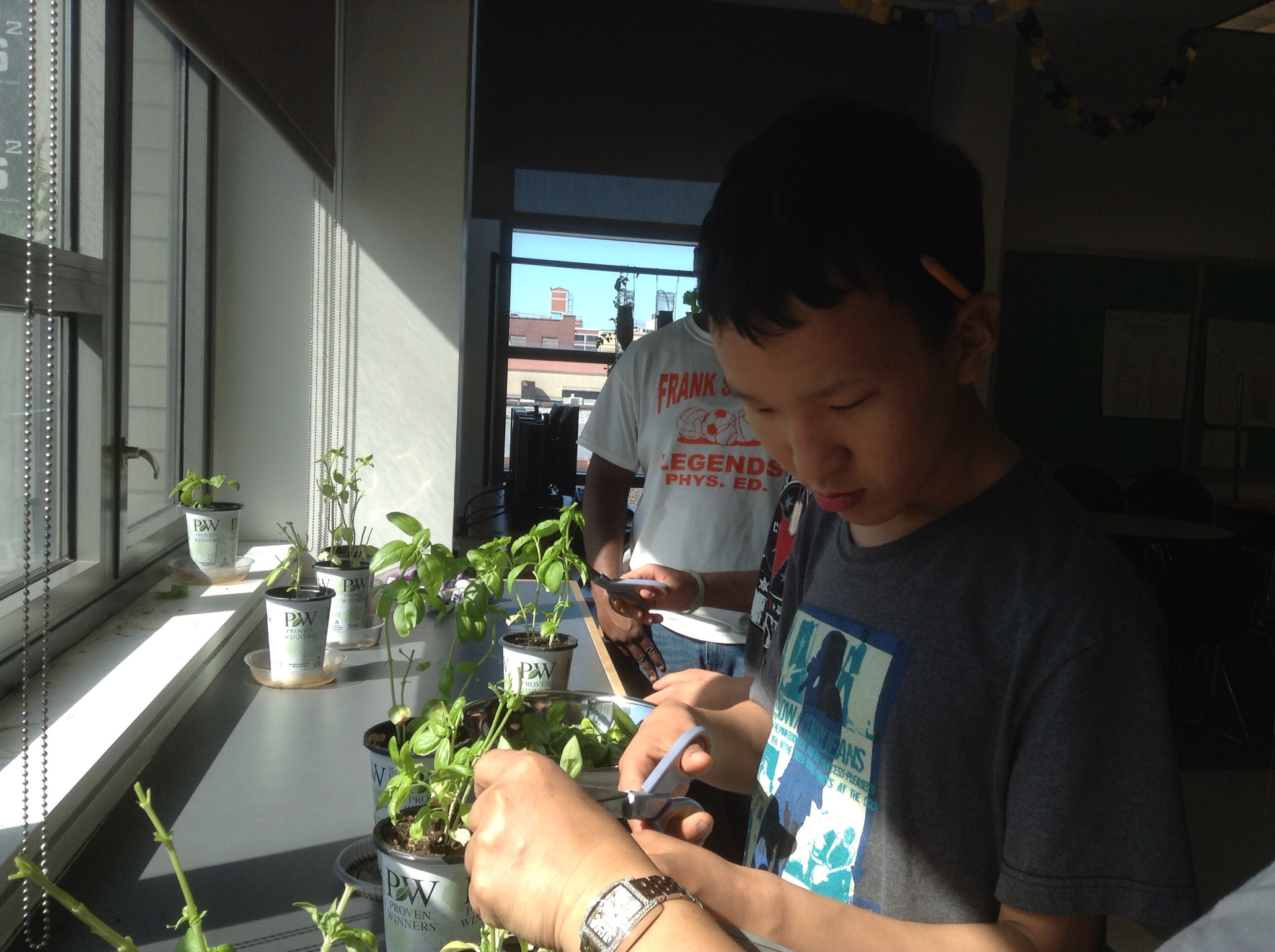 The students from 993 Q at Frank Sinatra HS made pesto pasta and salad from ingredients they grew in their classroom! Here they are selecting, clipping and blending the basil leaves for the pesto sauce. They also had a salad made from hydroponically grown lettuce from their classroom window farm. Yum!