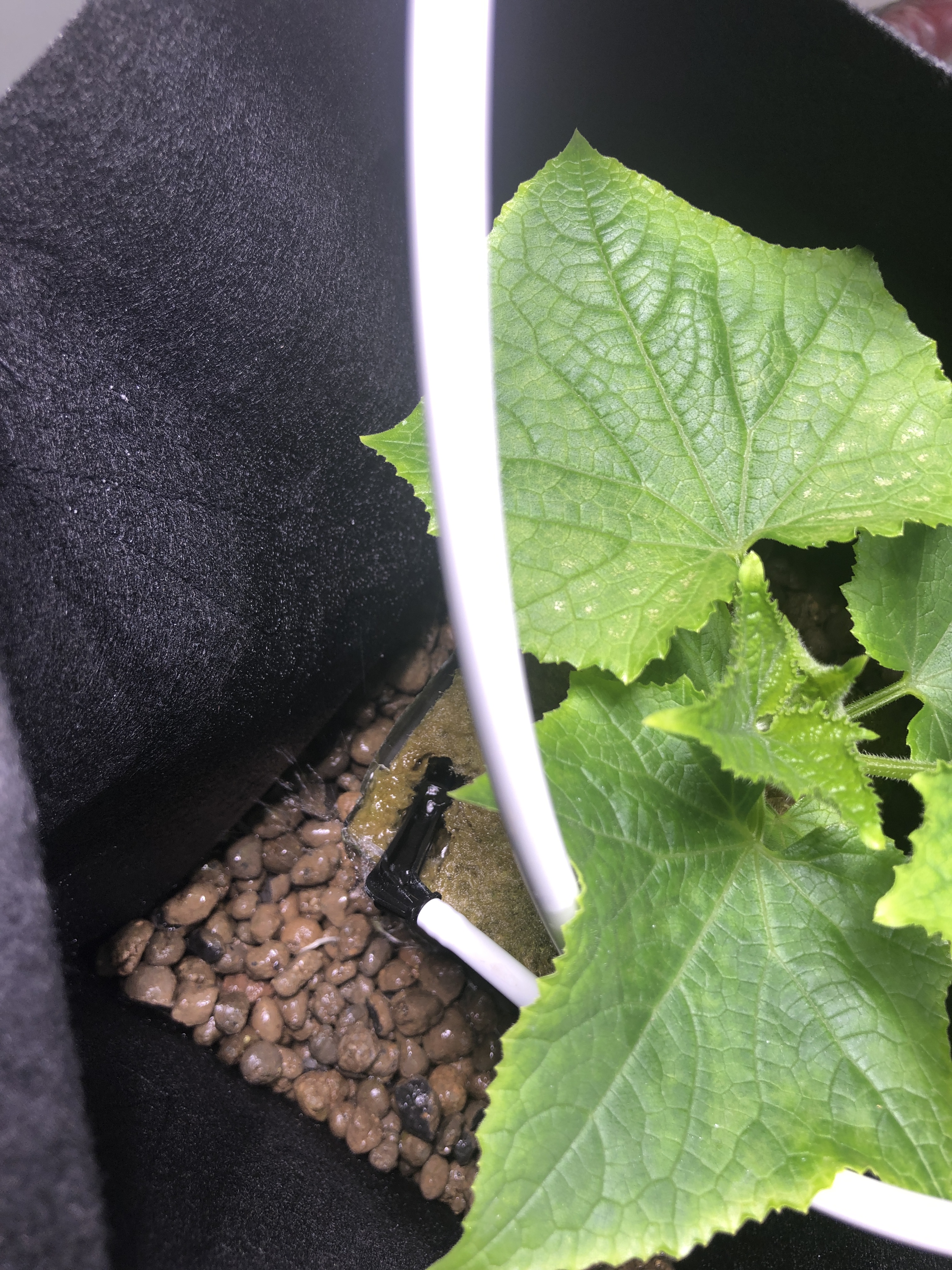 Close-up of one of the plants in the vine-crop system showing clay pellets and rock wool as the growing mediums