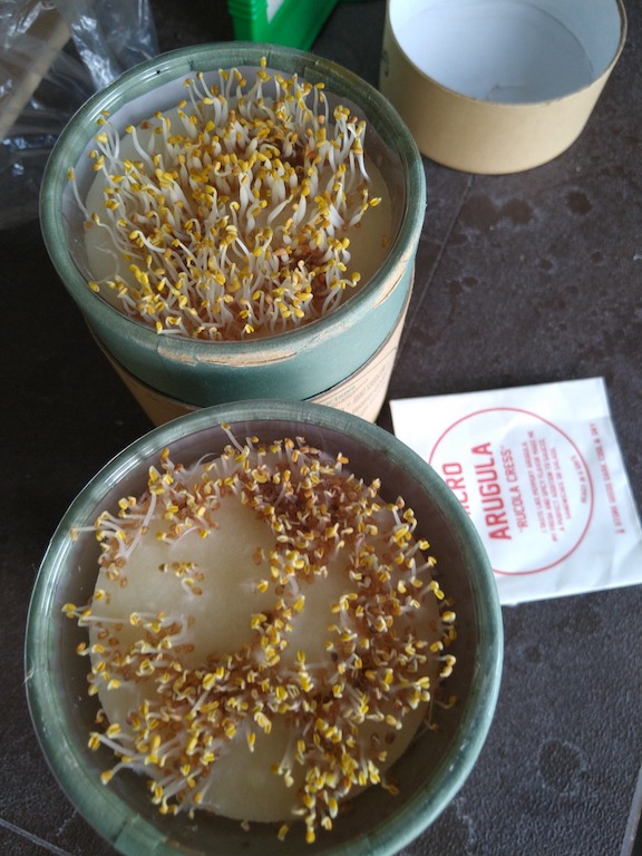 Here are two containers of micro arugula. The sprouts are surprisingly yellow…