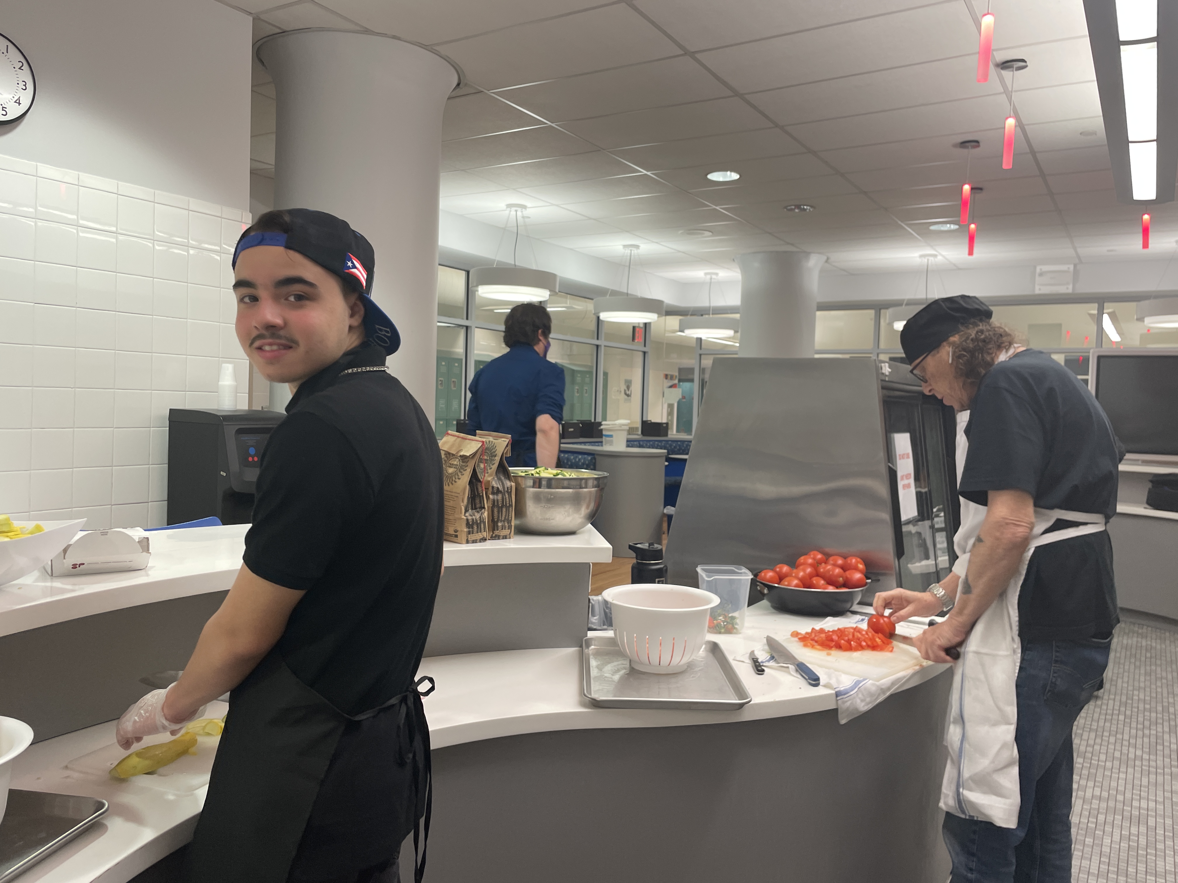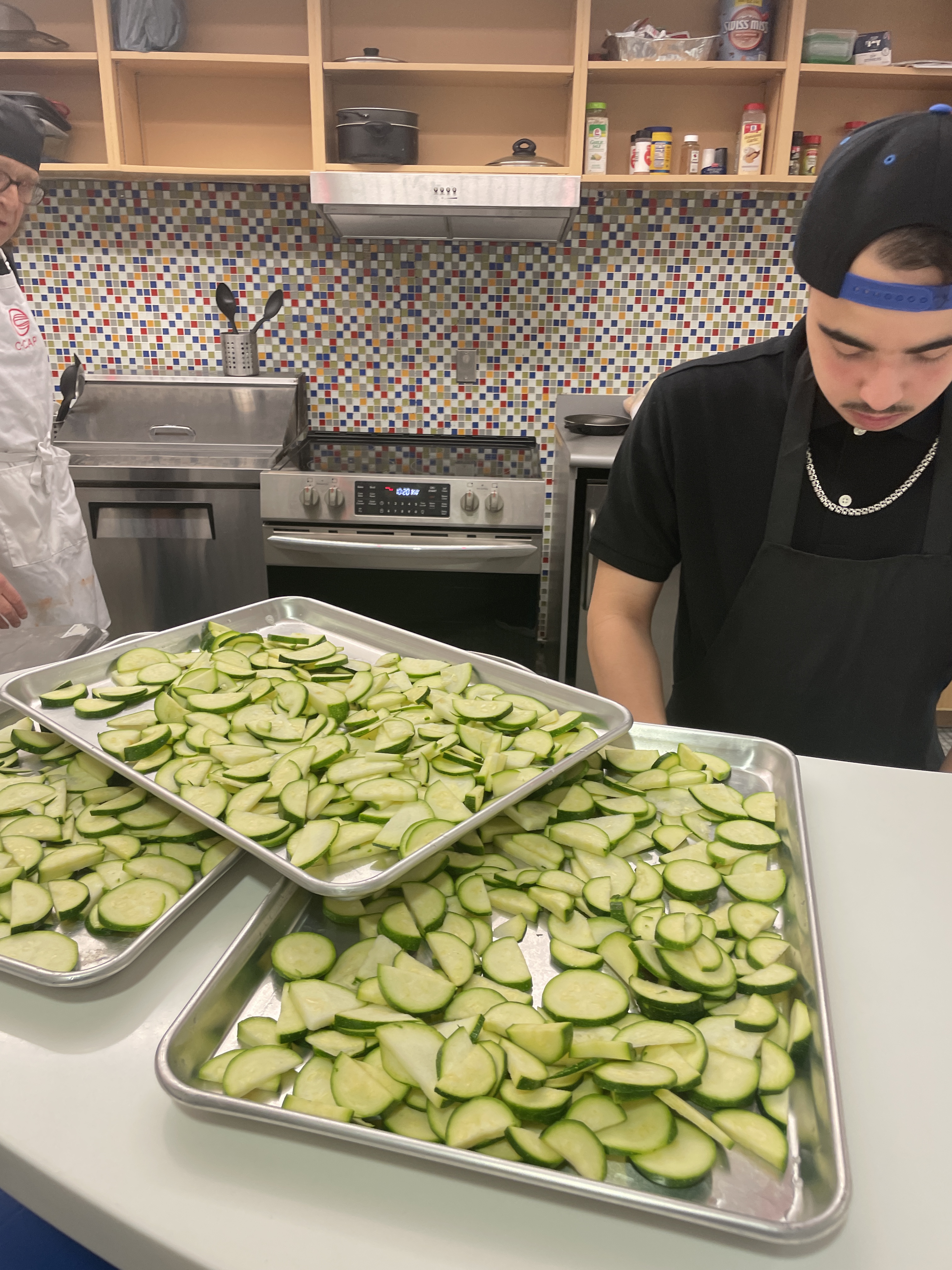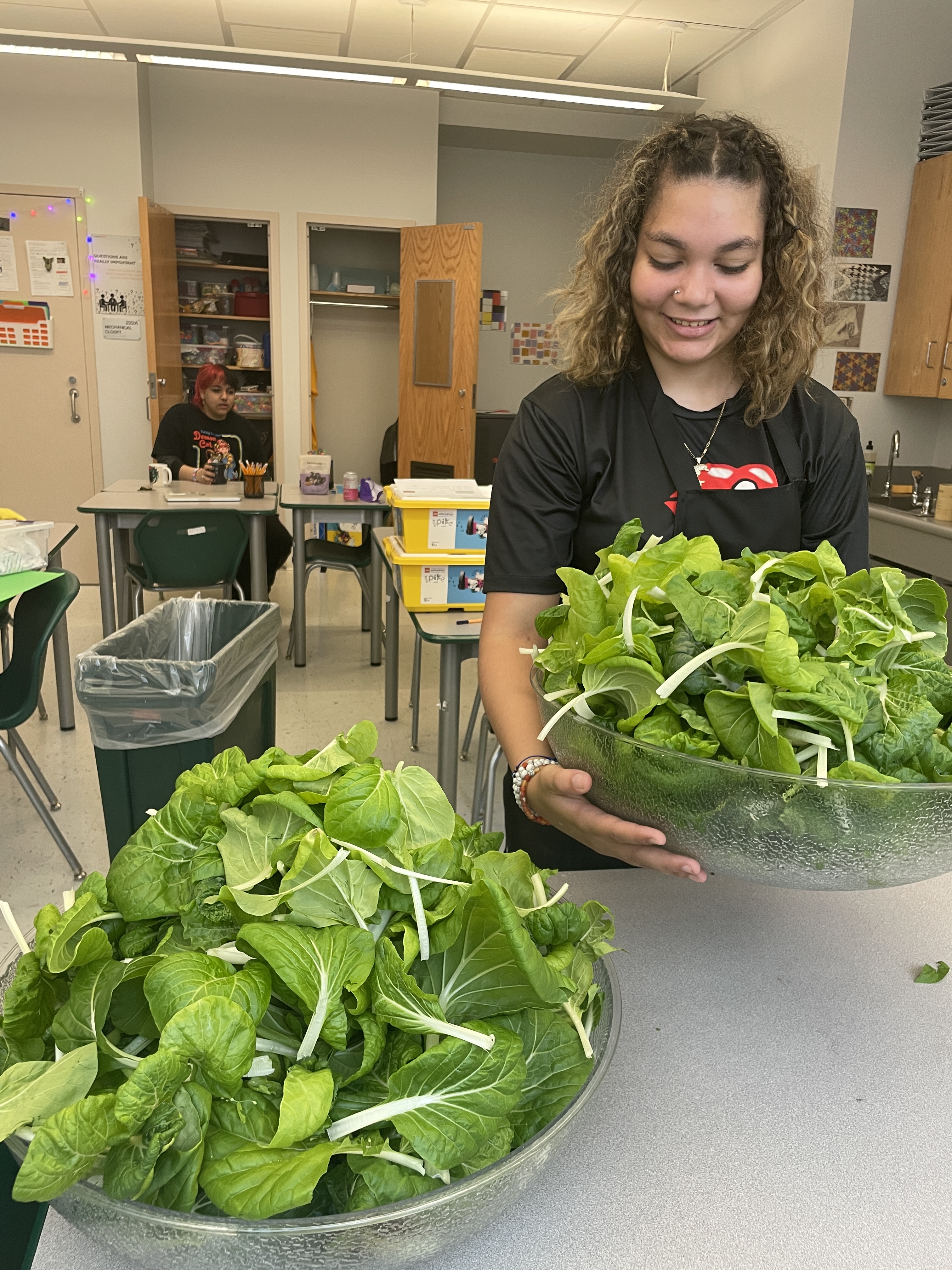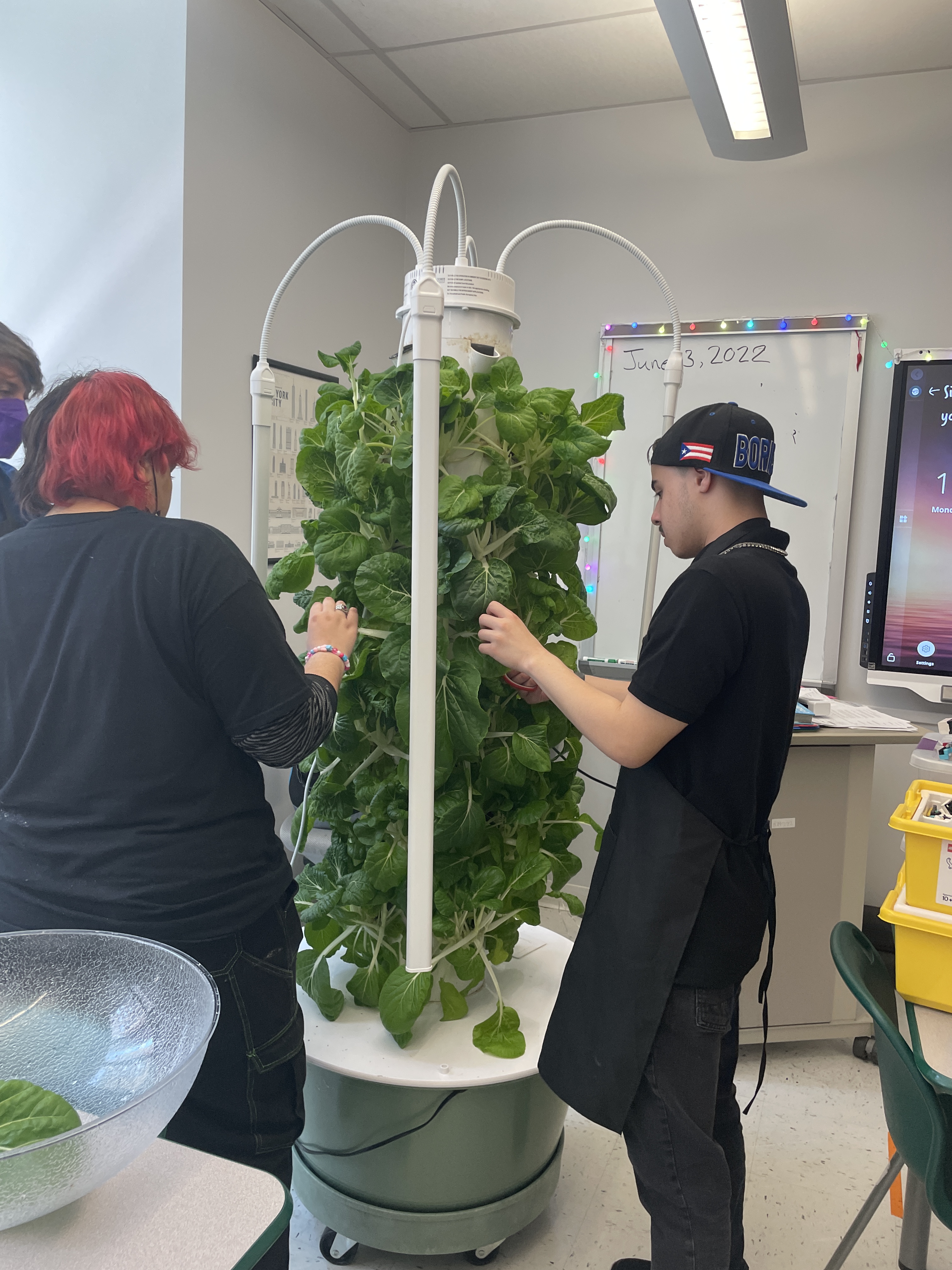 Chef George paid a visit to 35M @ Beacon last week to help the students prepare a delicious lunch of bean tacos with sauteed zucchini and salsa, and a bok choy salad with blueberry balsamic vinaigrette. Students prepped the zucchini, mixed and pressed the fajita dough from scratch, harvested the bok choy from Mr. Heath’s Tower Garden, and mixed it with salad greens and tomatoes. Yum!