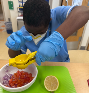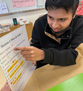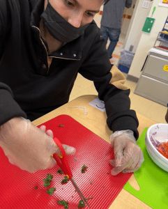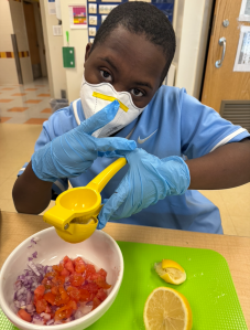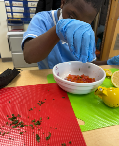 We also made tortilla chips using tortillas. The students loved the activity and were highly engaged. Each student had a specific role at their assigned station (such as chopper, mixer, measurer, and cleaner) , and they worked together to complete each step of the recipe.