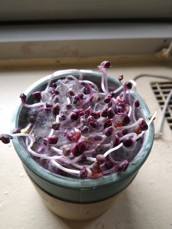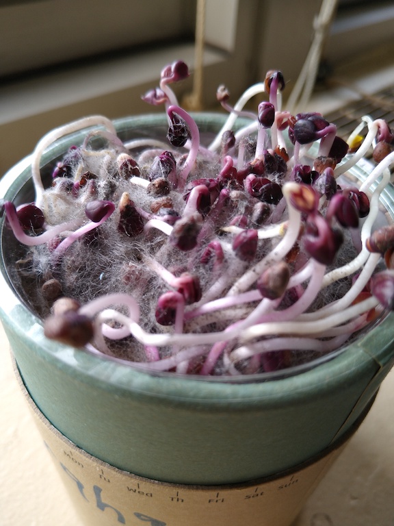 The Purple Radish sprouted, but so did the mold. There may even be a little critter in the bottom photo.